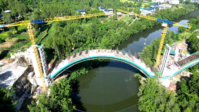 構溪河渡槽位于閬中市石灘鎮(zhèn)境內構溪河上,渡槽全長708m,最大架空高度達53m,是全線重點控制性工程。為保障施工順利推進,項目團隊多措并舉克服高空作業(yè)風險大、技術要求高、大跨度拱圈澆筑難、持續(xù)高溫紅色預警等多項挑戰(zhàn),堅守“內斂堅韌,勇毅篤行”企業(yè)精神,以“科學規(guī)范、集約高效”的精細化管理,統(tǒng)籌抓好質量、安全、進度、成本四大關鍵環(huán)節(jié)管控;創(chuàng)新采用“選擇代表性拱跨預壓”工藝,有效控制結構變形;嚴格遵循“縱向分段、豎向分環(huán)”的澆筑方案,確保拱圈受力均勻和線形精準;加強數(shù)字化監(jiān)管賦能全流程預警與閉環(huán)監(jiān)管,最終安全、優(yōu)質、高效完成合攏。