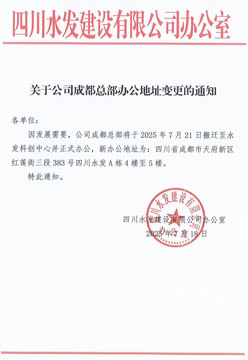 四川水發(fā)建設有限公司關于辦公地址變更的通知